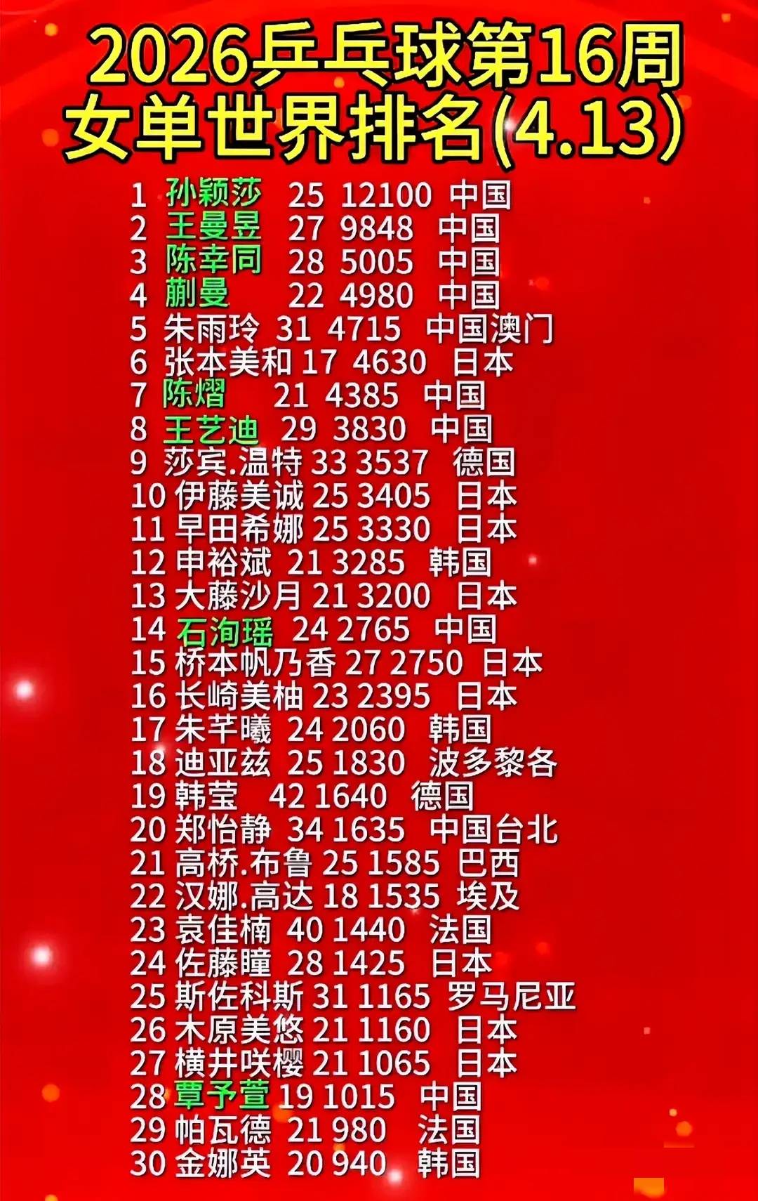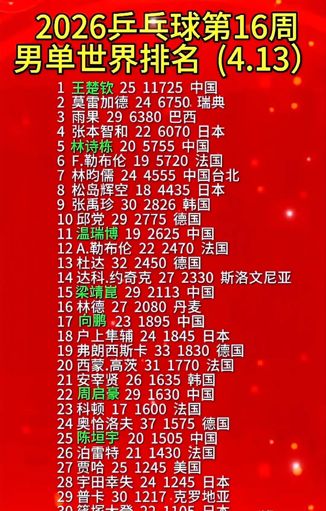 更猛的是世界排名. 国际乒联第16周排名一出, 温瑞博直接冲到第11位, 刷新个人新高. 在他前面的国乒选手, 只有王楚钦和林诗栋. 换句话说, 他现在已经是国乒男单第三号了.